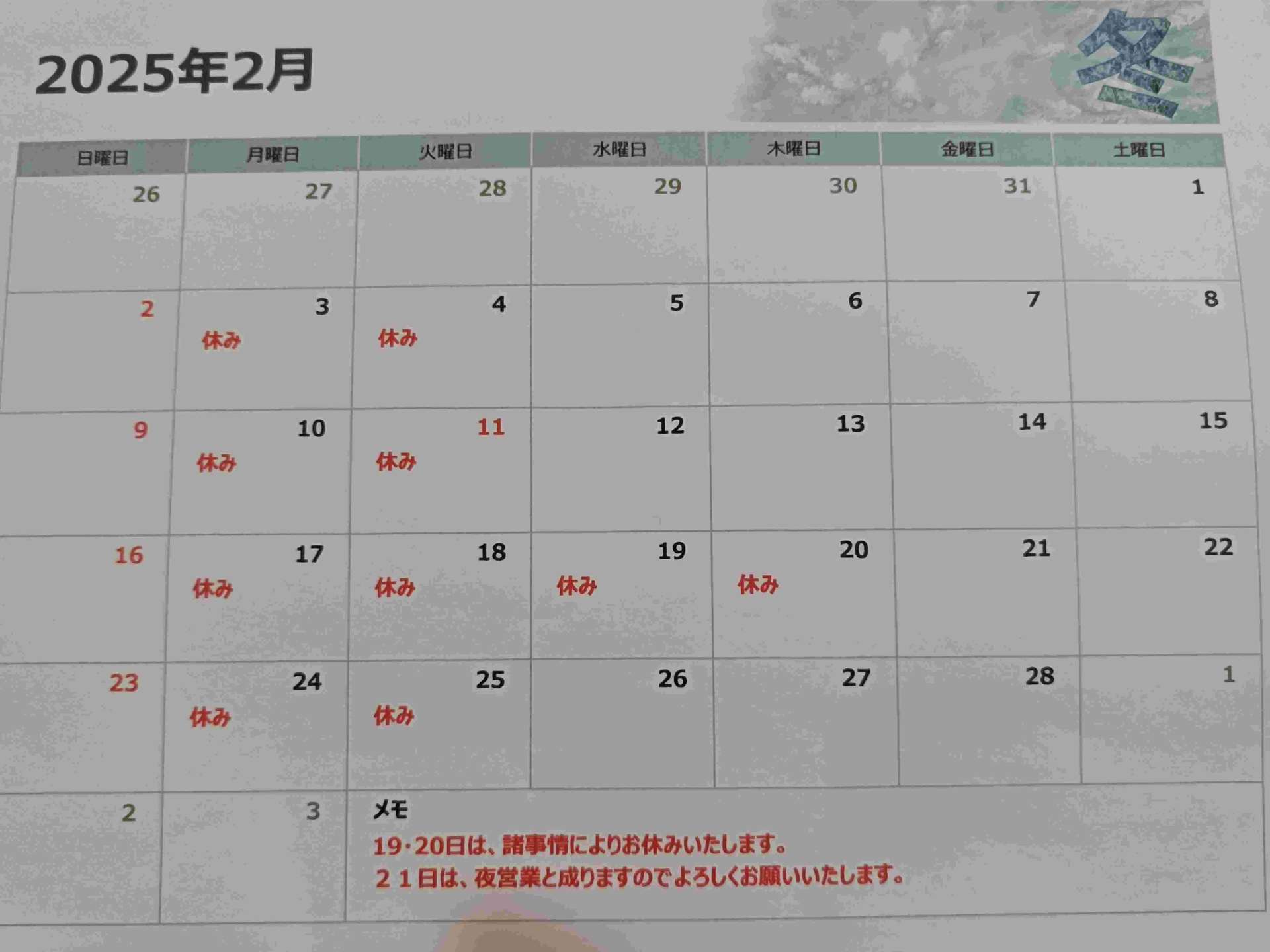 2025年2月営業カレンダーになります。